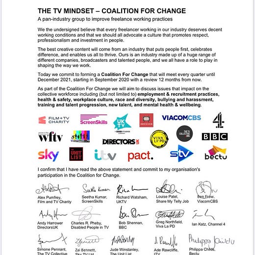 During the pandemic, The TV Mindset worked with institutions across the industry to create the Coalition for Change, out of which came the Freelancer’s Charter. It aimed to have all major broadcasters - who did join the coalition, and signed the charter - commit to better working conditions for freelancers.